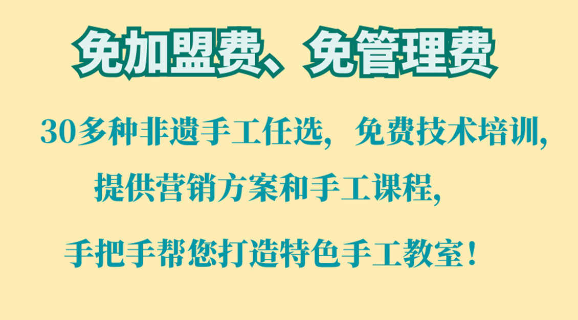 免加盟费! 100多项手工任选,20-300 平方均可开店! 了解不花钱,留言领取详细资料! 请放心,您的信息我们绝对保密!